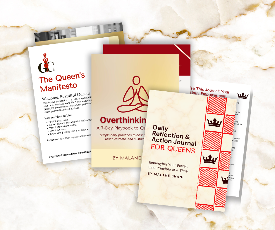 The Queen’s Code Starter Kit helps you embody your power, protect your peace, and lead with clarity. This 3-part digital bundle gives you guided journals, playbooks, and affirmations designed to: